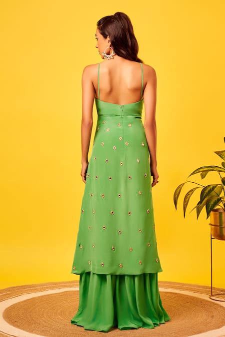 Buy_Harshita Singhvi_Green Crepe, Linen Cut Work, Mirrors Hand Embroidered Tunic And Sharara Set_at_Aza_Fashions