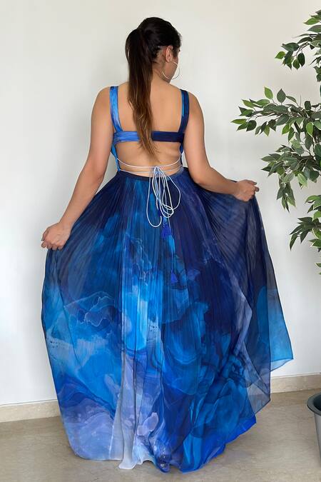Blue marble and ocean print ruched long dress featuring a V neckline and sleeveless design