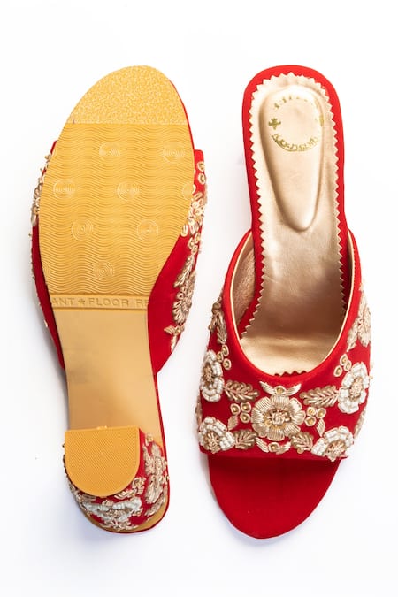 Red block heels featuring floral embroidery in zari work