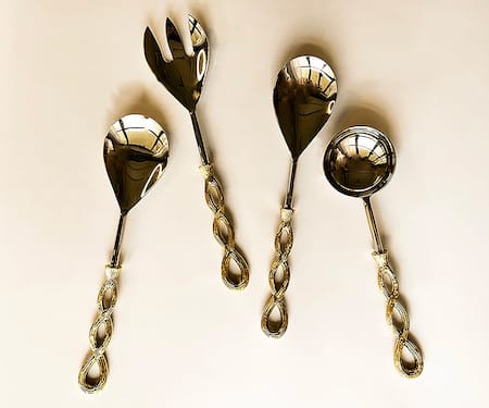 Size L x B (inch):, Fork: 10.7 X 2.5, Spoon: 10.7 X 2.5, Ladle: 9.8 X 3.8, Weight (kgs): 0.683, Dishwasher Safe: No, Microwave Safe: No, Disclaimer: Each product is moulded and engraved keeping in mind the intricate details. Due to the handcrafted nature of this item, expect variation in the appearance and finish of each unique piece.