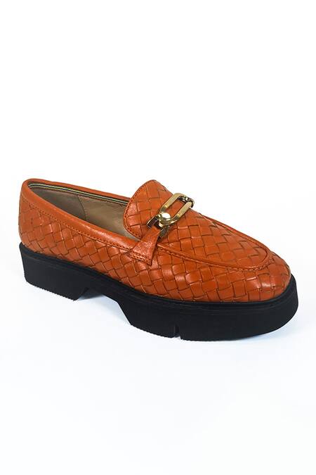 Orange genuine leather loafers featuring a textured design and golden buckle embellishments