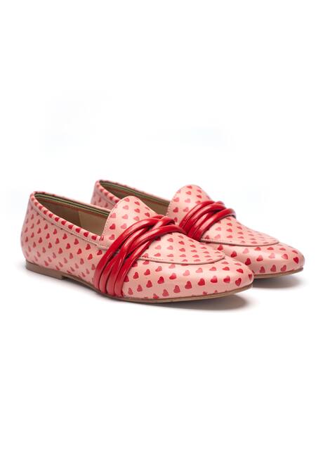 Pink velour loafers featuring a heart print design and red cording on the top