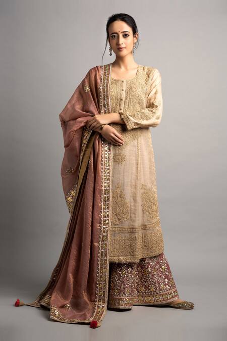 Gold straight kurta with all-over floral motif dori work. Comes with rose pink gharara pants & tassel dupatta.