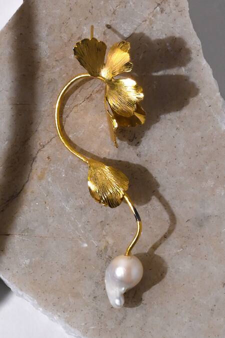 Gold danglers featuring unstructured floral petal design with pearl detailing