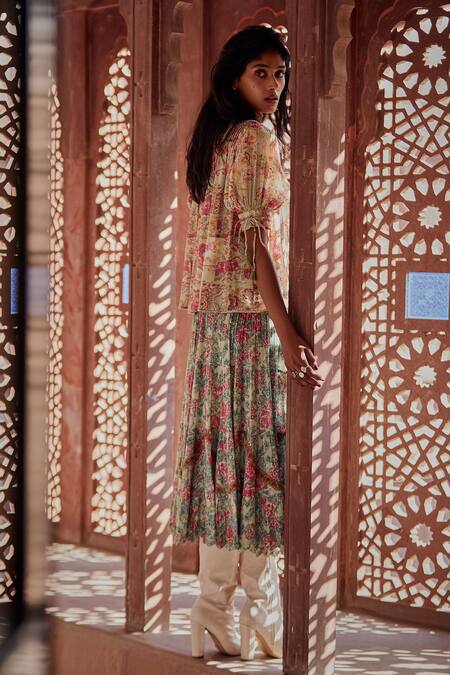 Green top with floral motifs, puff sleeves & mandarin collar.