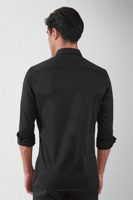 Black shirt featuring full sleeves and collar neckline with stripe patchwork embellishment
