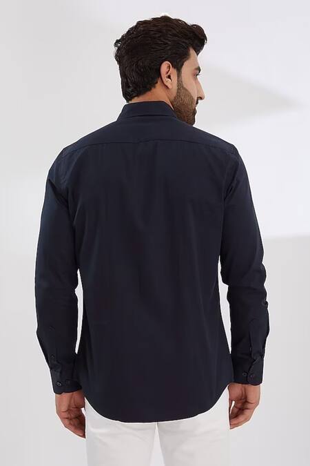 Navy blue button down shirt featuring an elephant chariot print on the sleeves