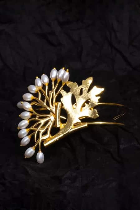 Gold bracelet featuring intricate carving details adorned with pearl embellishments