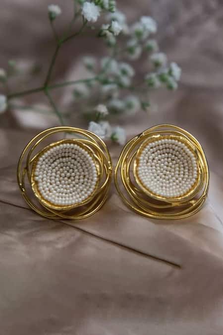 Gold stud earrings featuring a unique vati design embellished with pearls