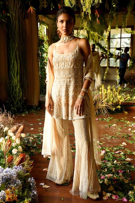 Buy_Reynu Taandon_Beige Dupatta Net U Neck Hibiscus Short Kurta Sharara Set_Online_at_Aza_Fashions
