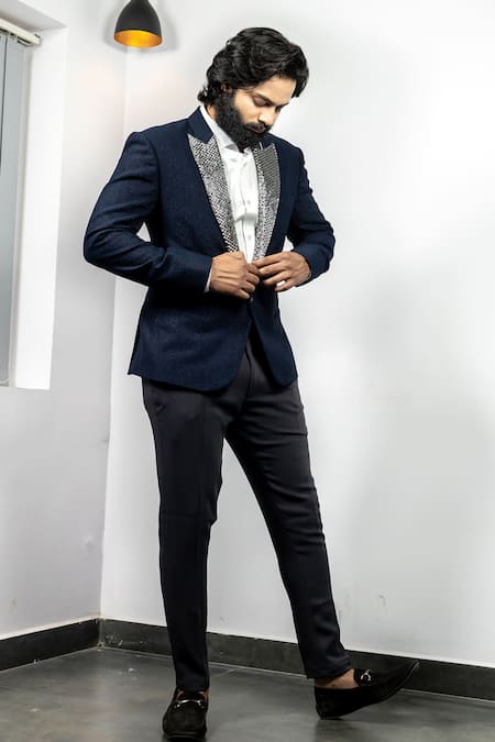 Blue shimmer blazer featuring a woven silver lapel collar and button front closure
