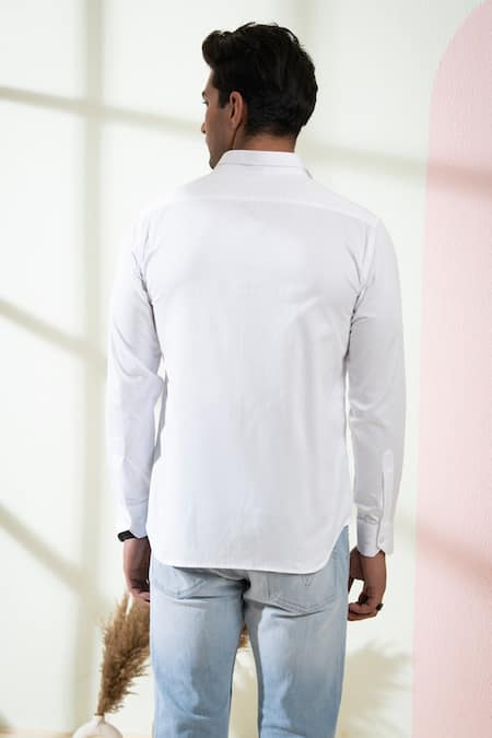 White cotton satin shirt featuring a horizontal black stripe on the chest