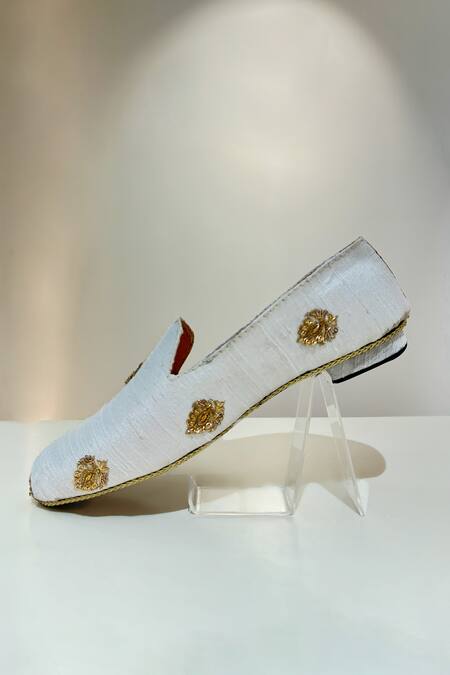 Off white slip-on shoes crafted from raw silk featuring bead and sequin embroidered butti patterns