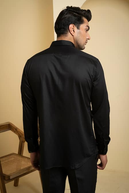 Black cotton satin shirt featuring abstract placement embroidery on the left side