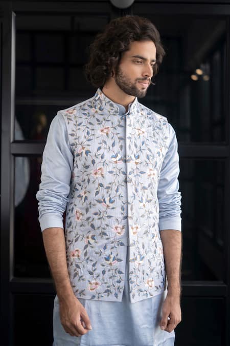 Powder blue bundi with floral embroidered motifs. Paired with kurta & contrast pant.