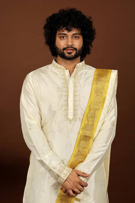 Off-white pattu silk kurta featuring zardozi and gold thread embroidery on the neckline and sleeve hem. Paired with a dhoti pant and a kanduva.
