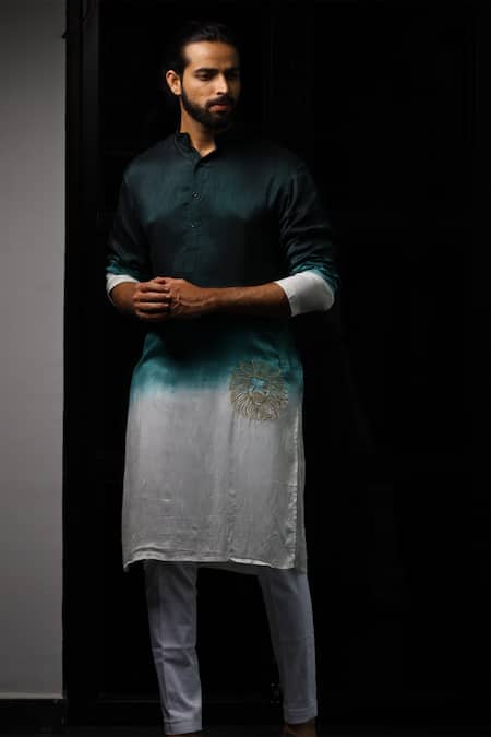 Green kurta with lion embroidered placement motif & front buttons.