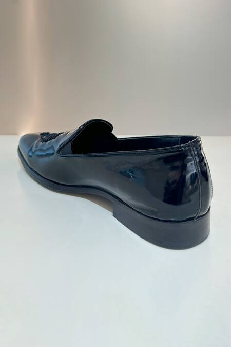 Black patent leather shoes featuring an embellished floral pattern in a glossy finish