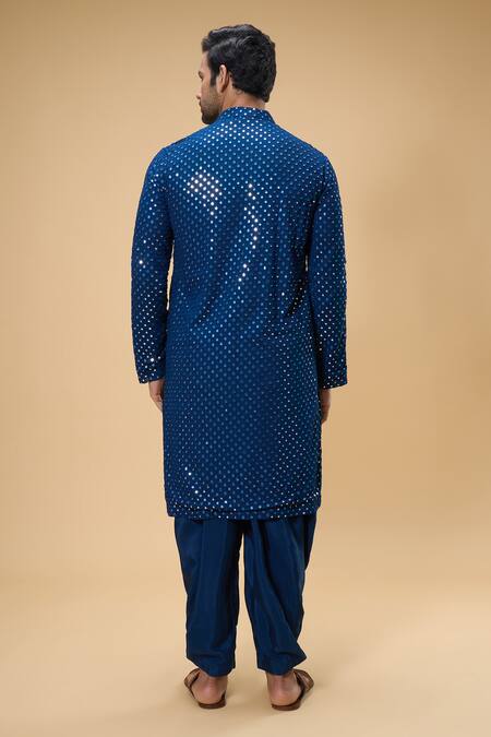 Blue kurta featuring all-over mirror embroidery and a concealed placket. Paired with elasticated patiala pant for a comfortable fit.