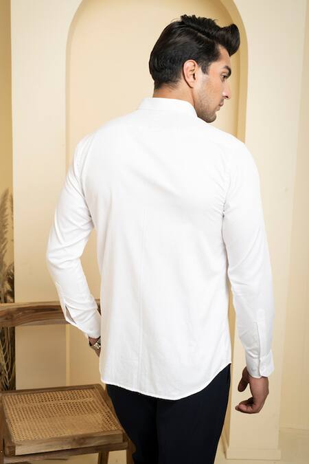 White cotton satin shirt featuring placement crescent moon motif with thread and bead embroidery. Includes a collar, full sleeves, and a front concealed placket closure.