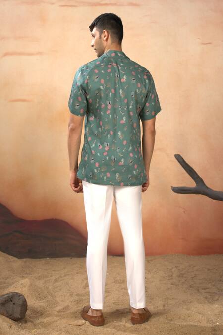 Green shirt featuring half sleeves and Cuban collar, adorned with an oceanic mirage print. Paired with matching pants for a cohesive look.