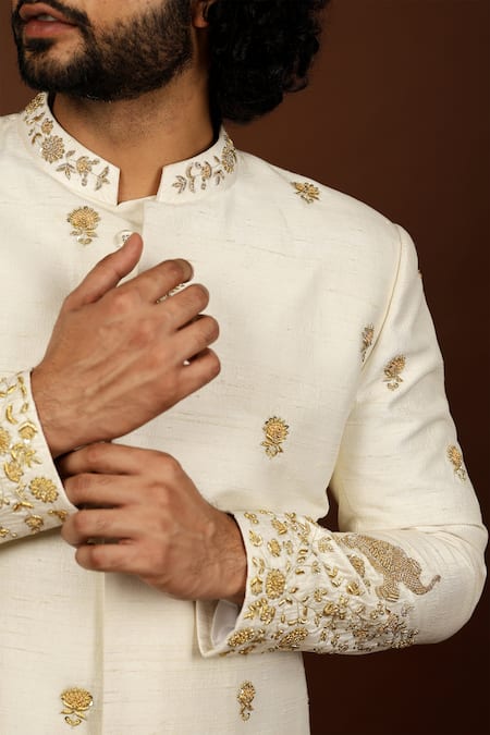 Ivory sherwani featuring gold elephant motif hand embroidery with floral and zari jal work. Paired with a dhoti pant and a kanduva.