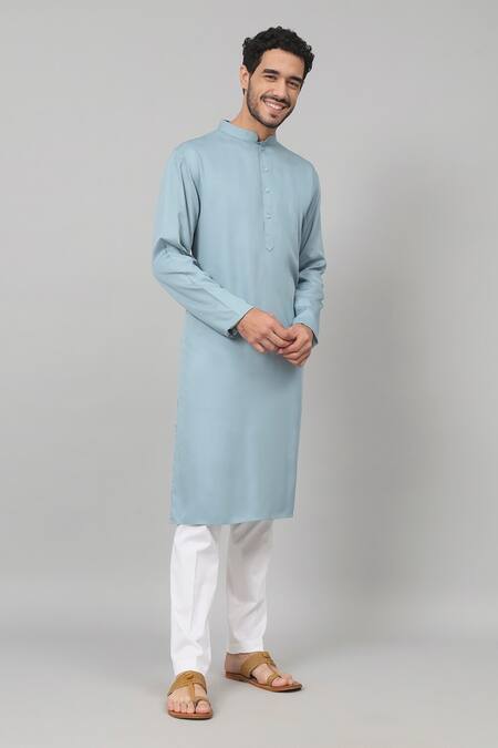 Blue straight kurta featuring a stand collar and full sleeves. Paired with relaxed fit pants with half elastic closure.