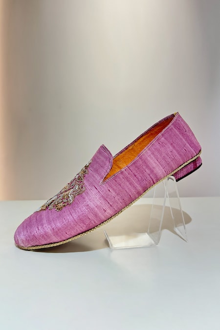 Purple shoes made from raw silk featuring zardozi embroidered floral patterns