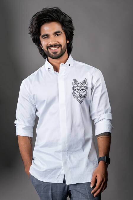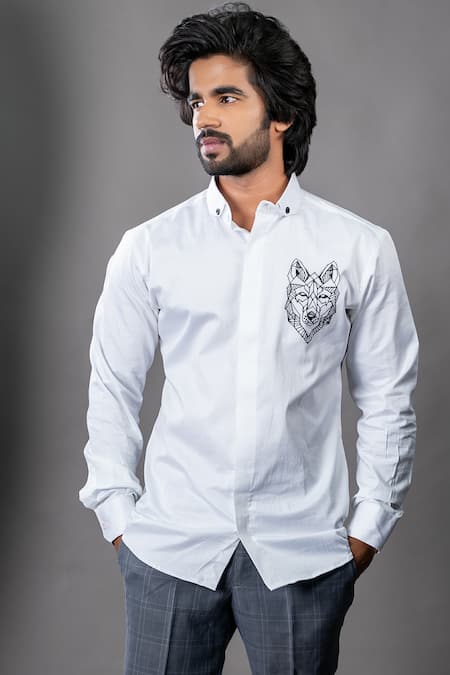 Buy_Hilo Design_White Cotton Satin Embroidery Wolf Shirt_at_Aza_Fashions
