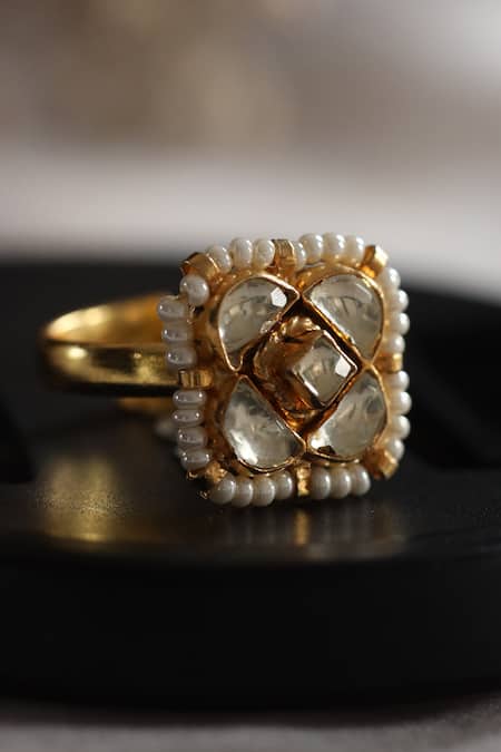 Gold plated ring featuring a kundan studded square motif, embellished with shell pearls
