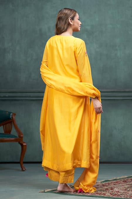 Yellow A-line kurta featuring pintuck detailing and placement 3D flower hand embroidery. Paired with a pant with pintucked hem and a dupatta adorned with scattered butti work and attached tassels.