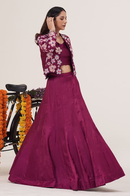 Pink lehenga featuring a flared design in gajji silk. Paired with a sleeveless blouse and a full-sleeved collared jacket adorned with floral bead embroidery.