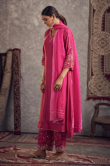 Pink kurta featuring floral hand embroidery with a V neckline and three quarter sleeves. Paired with a golden sequin embroidered pant and an organza dupatta.