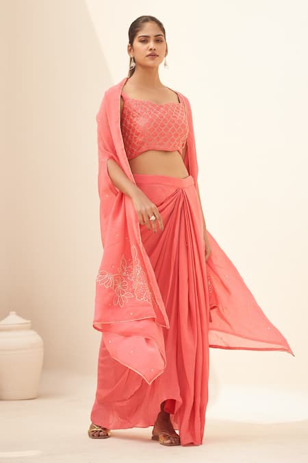Peach blouse featuring sweetheart neckline and bead & thread work. Paired with a draped skirt and an open jacket with batwing sleeves and asymmetric hem.