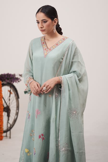 Sea green A-line kurta in gajji silk featuring floral garden sequin and bead embroidery. Paired with matching embellished straight cotton pant and spluttered sequin organza dupatta.