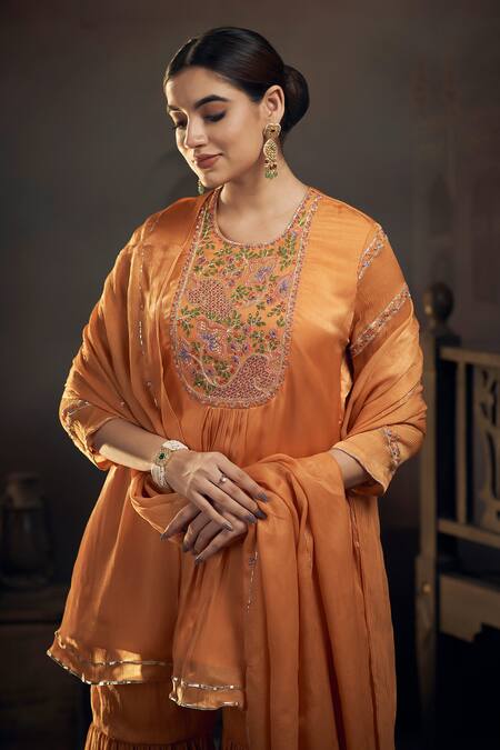 Mango yellow peplum kurta featuring hand embroidery on the yoke. Paired with a matching sharara and dupatta.