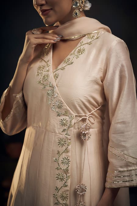 Beige Silk, Organza, Cotton Gota Patti V-neck Flower Work Angarkha Pant Set