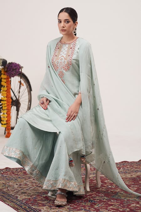 Sea blue embroidered kurta featuring round neckline and three-quarter sleeves. Paired with a gota embroidered sharara and an organza dupatta with tassels.