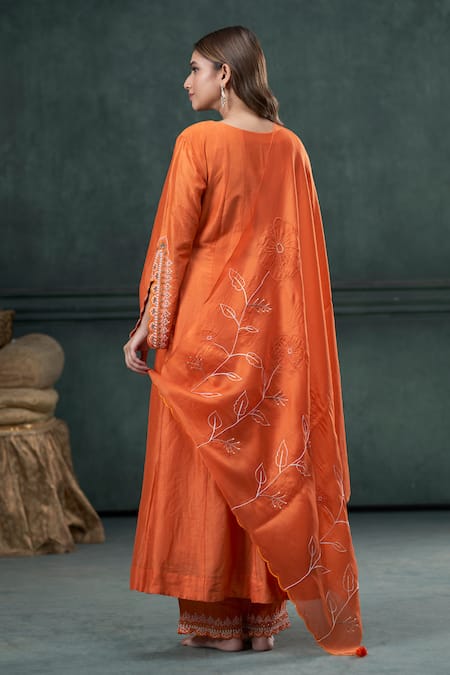 Orange anarkali featuring thread and moti embroidery at the neckline and sleeves. Paired with an embroidered pant and a scalloped organza dupatta with tassels.