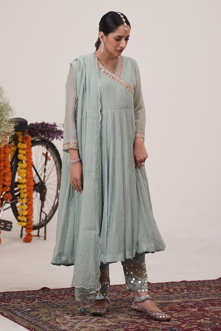 Side tie-up detail on angarkha, Scatter tikki scallop borders on dupatta, Sequin embellishments on pant
