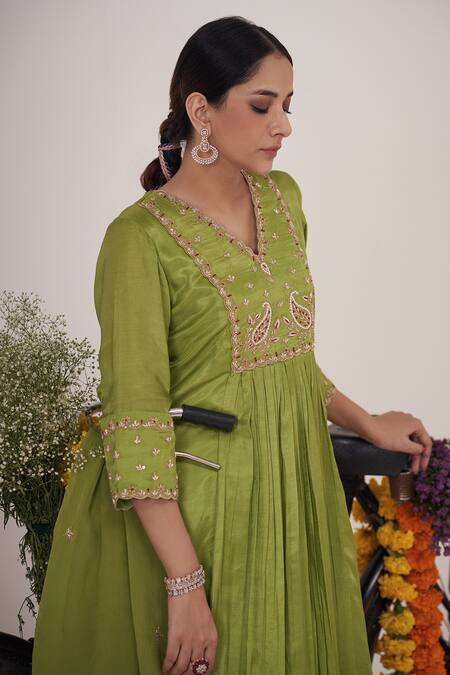 Green anarkali featuring scallop V neck, three fourth sleeves, and pleated flare in gajji silk. Paired with matching embellished cotton pant and organza dupatta with tassels.