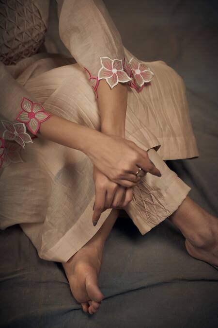 Beige kurta in chanderi fabric featuring smocked detailing and self-flower patterns on the sleeves. Paired with matching pants that have a front belt and back elasticated waist.