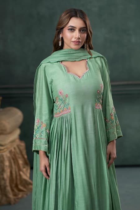 Green Mohair, Cotton, Chanderi Embroidery, Thread Hand Gathered Kurta Set