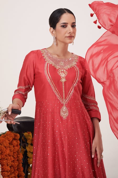 Red Silk, Chanderi, Cotton, Organza Zari Round Zardosi Work Anarkali Pant Set
