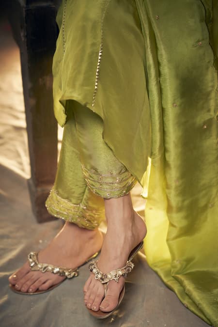 Green straight kurta featuring hand embroidered zardozi work. Paired with a tissue pant and scalloped dupatta.