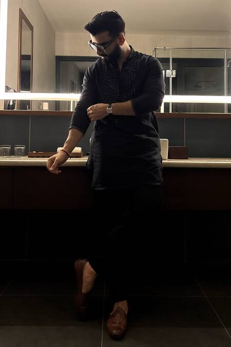 Black chanderi kurta featuring self gunmetal bead and sequin embroidery. Paired with a matching salwar.