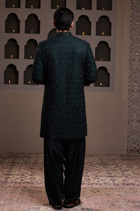 Green achkan featuring black cutdana and thread embroidery. Paired with a black cotton silk kurta and patiala salwar.