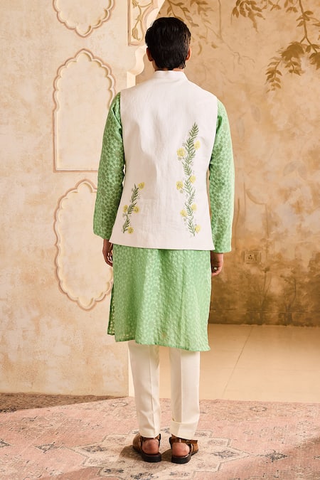 Ivory bundi featuring 3D floral, thread & cutdana embroidery. Paired with a jade green kurta and pant with floral pattern.