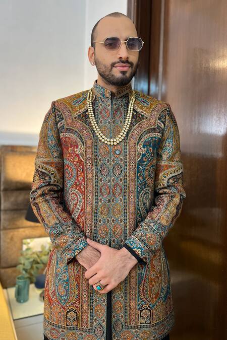 Jamawar paisley woven pattern, Intricate detailing on sleeves, Band collar design