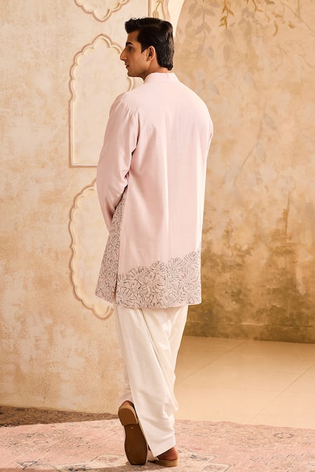Pink kurta featuring full sleeves, mandarin collar, and intricate petal applique with bead and cutdana embellishments. Paired with a coordinating salwar for a complete look.